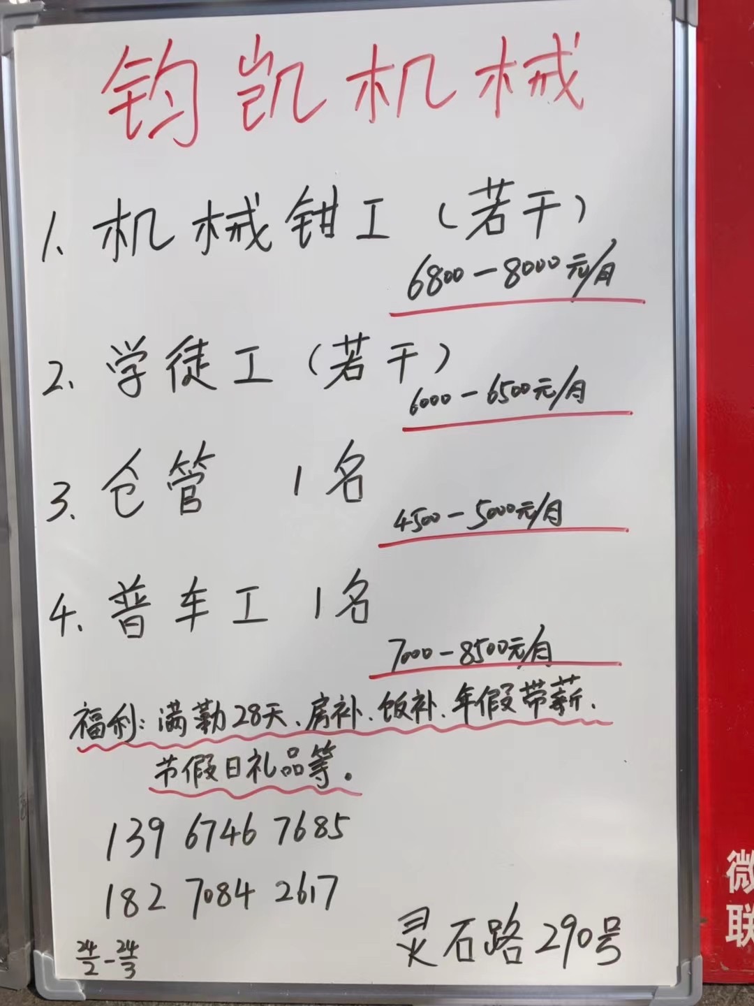 1.機(jī)械鉗工(若干)6800-8000/月