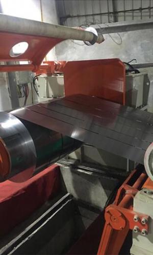 設(shè)備在工作時(shí)送料機(jī)構(gòu)處于被動(dòng)送料狀態(tài),板料通過(guò)夾送并經(jīng)板頭液壓剪床剪去不規(guī)則料頭后經(jīng)側(cè)向引導(dǎo)機(jī)構(gòu)進(jìn)入圓盤(pán)剪切機(jī)剪切成客戶(hù)需要的帶狀條料??v剪過(guò)程中,通過(guò)廢邊卷取機(jī)對(duì)縱切下來(lái)的廢邊迅速進(jìn)行收取成卷狀??v切下來(lái)的帶料,通過(guò)活套緩沖,并經(jīng)過(guò)兩組分離裝置進(jìn)入張力站,通過(guò)該張力裝置和卷取機(jī)建立所需的收卷張力,以防止卷取后塌卷。最后由卸料機(jī)構(gòu)把料卷從收料軸上卸到出料小車(chē)后運(yùn)出。